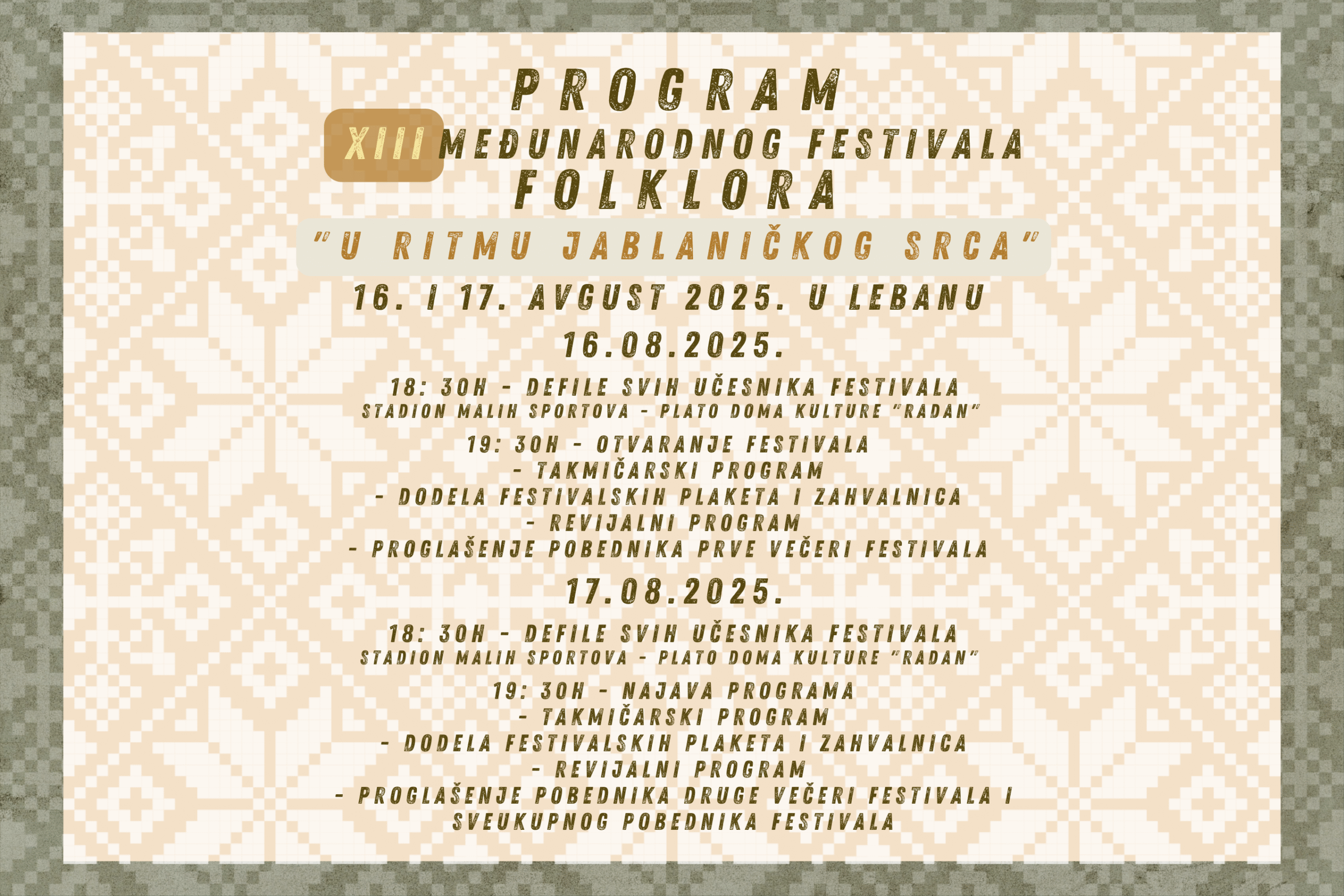 Тринаести међународни фестивал фолклора „У ритму јабланичког срца“ је одржан 16. и17. августа 2025. у Лебану.