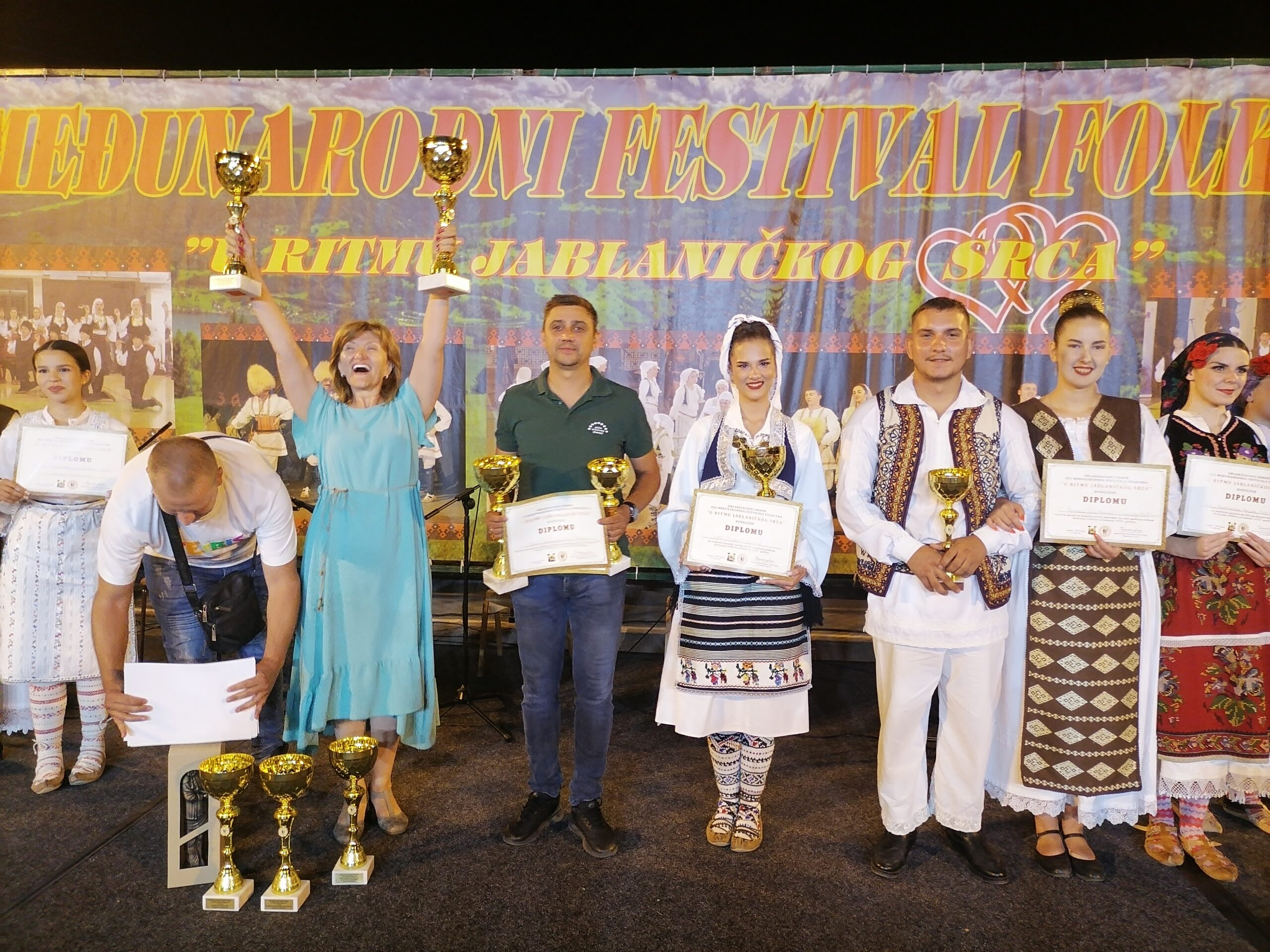 Под покровитељством локалне самоуправе, друштво је оснивач и суорганизатор Међународног фестивала фолклора ‘У ритму јабланичког срца’, који половином августа у Лебане доводи двадесетак ансамбала из земље и света. Манифестација се одржава два, некада и више дана, зависно од броја пријављених учесника. Програм садржи неколико делова: техничку пробу сваког ансамбла, дефиле у пратњи блех-оркестара, заједничко коло свих учесника на платоу у центру Лебана, ревијалне игре и такмичарске кореографије. Сваке вечери програм се завршава доделом награда најбољим ансамблима, а последњег дана фестивала награђују се најуспешнији у категоријама: ‘Гранд-при фестивала’ – свеукупни победник, ‘Најбољи ансамбл фестивала’, ‘Најбоља кореографија’ и ‘Најбољи домаћи или страни ансамбл’.